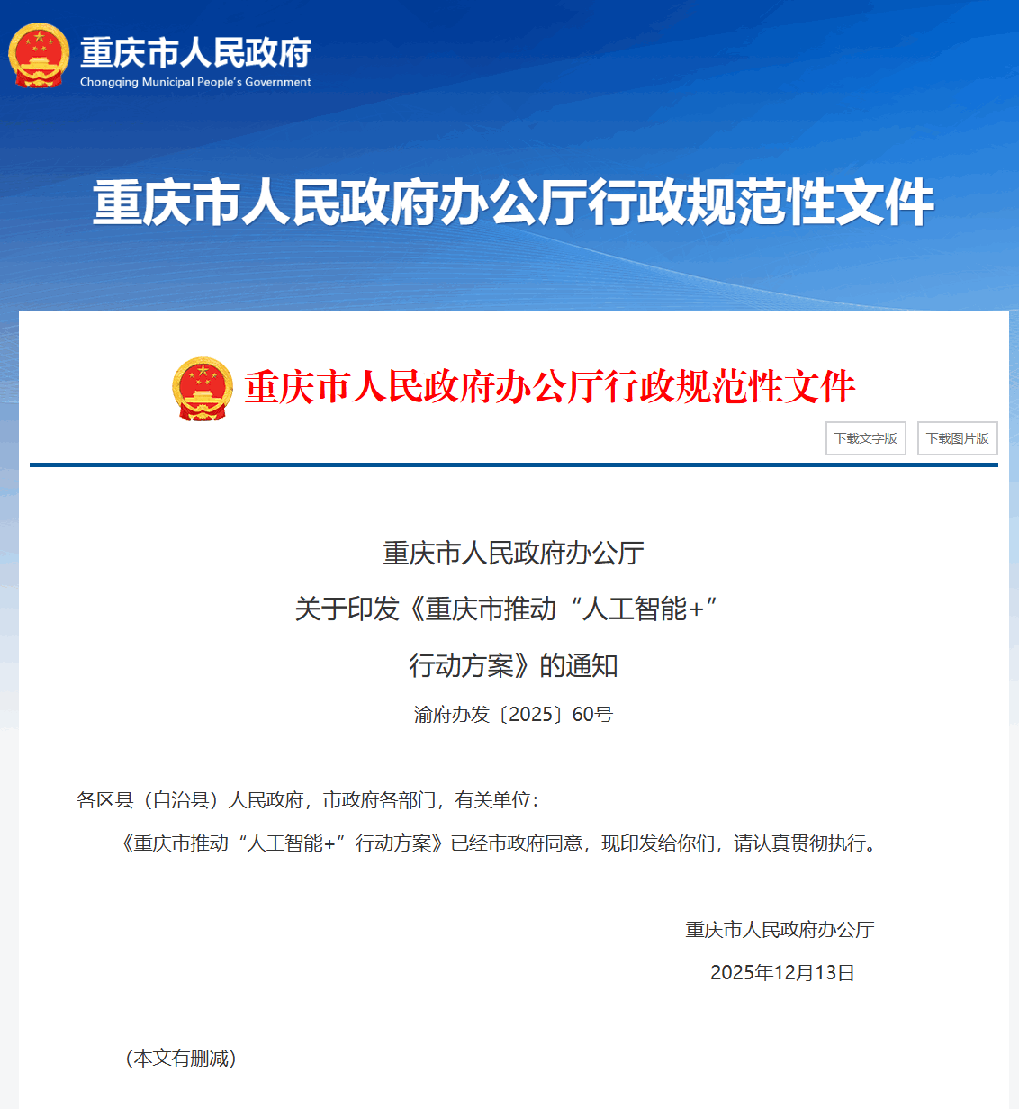 重庆出台15条政策推动“人工智能+”行动 到2027年新一代智能终端及智能体普及...