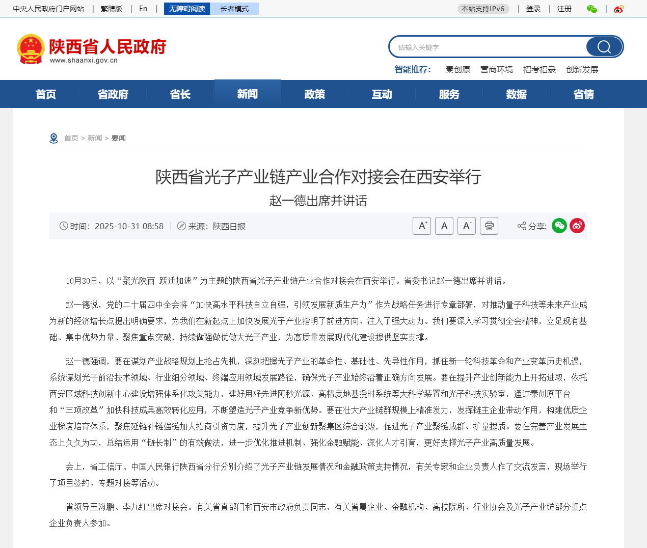 陕西省光子产业链产业合作对接会在西安举行 赵一德出席并讲话