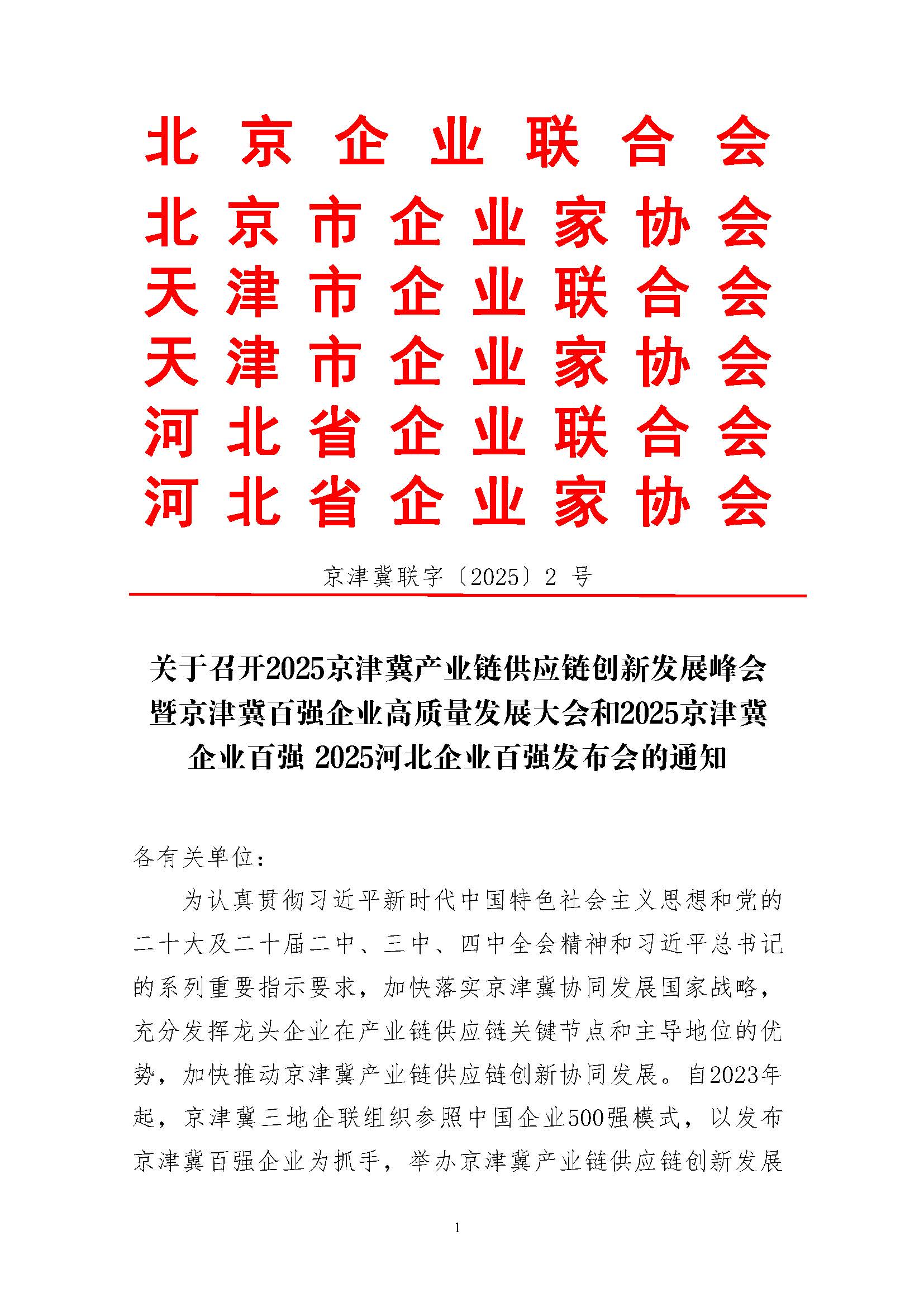 关于召开2025京津冀产业链供应链创新发展峰会暨2025京津冀企业百强发布会的通...